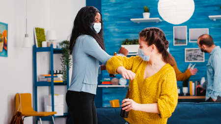 Mixed race of women with face masks greeting using elbow meeting at new normal party respecting social distancing. Diverse friends enjoying a beer, socializing in living room during global pandemic