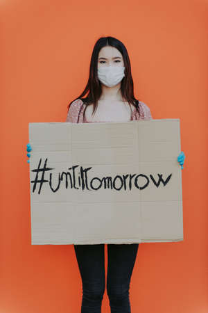 life after the covid-19 pandemic outbreak, woman holding Masks save lives text towards the camera shot at shallow depth of field