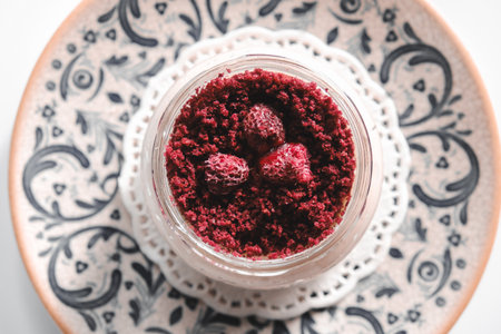 Cinematic dessert close-up showcases vibrant colors and rich textures from an overhead perspective
