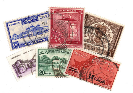 Vintage postage stamps from Pakistan isolated on a white background.