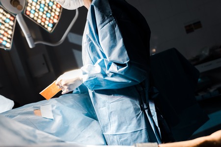 Cropped view of nurse in uniform and latex gloves putting on strip in operating room