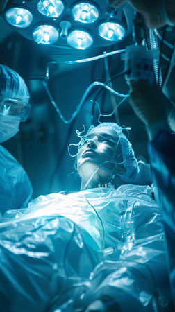 An international team of doctors performs a complex surgical operation on a patient under anesthesia. Modern operating room and experienced surgeons save lives.
