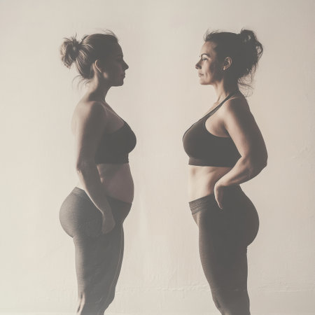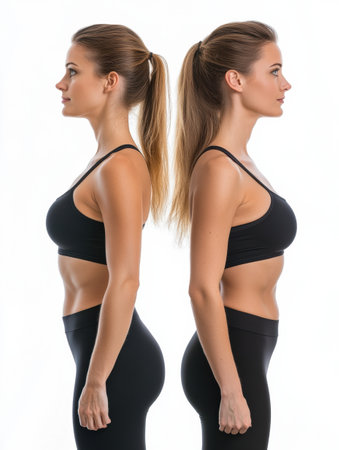 The transformation of a womans body, highlighting her journey from slightly overweight to toned and fit.