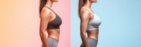 A womans body transforms from slightly overweight to toned, highlighted by vibrant fitness studio lighting.