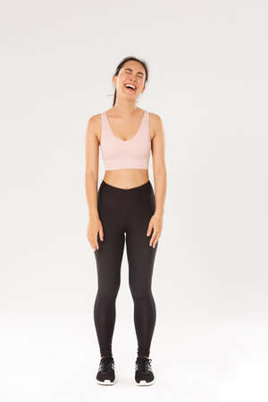 Full length of smiling slim and strong female fitness coach, female athelte in sportswear turn behind to look at camera with pleased, motivated expression, girl ready for workout, white background
