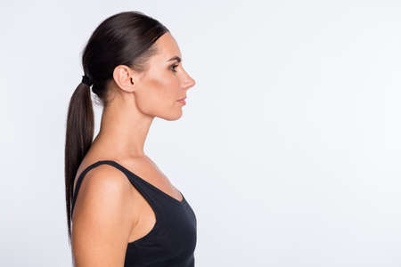 Profile side photo of young beautiful charming serious sporty woman look copyspace isolated on white color background