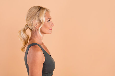 Profile side photo of charming lady looking empty space anti age therapy beauty product cream peeling isolated on beige color background