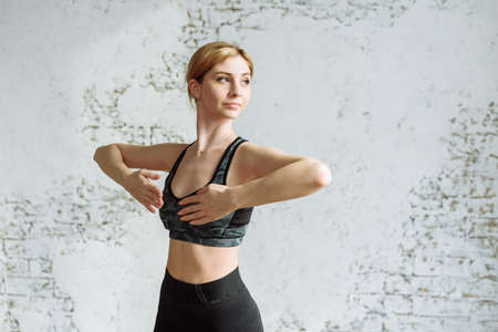 Lovely young girl goes in for sports at home in a sports uniform on a rug. Cute blonde is engaged in fitness on a background of a white brick wall.