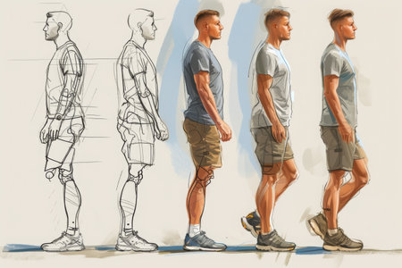 A collection of sketches depicting a man in different poses and positions, Illustrate the progress of a patient from start to finish of a physical therapy program, AI Generated
