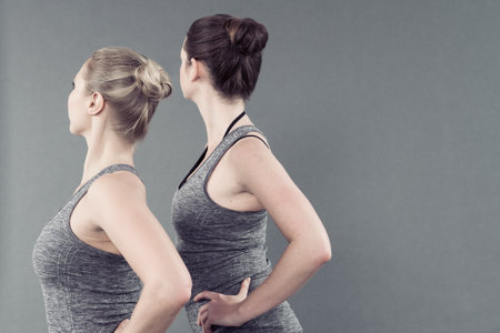 Young women practising yoga, grey background