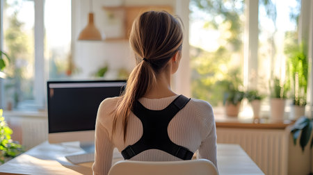 Woman Wearing Supportive Posture Brace in Minimalist Home Office Setup with Ergonomic Chair in Focus, Highlighting Workplace Wellness and Prevention Concepts