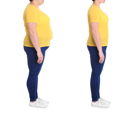 Collage with photos of woman before and after weight loss diet on white background