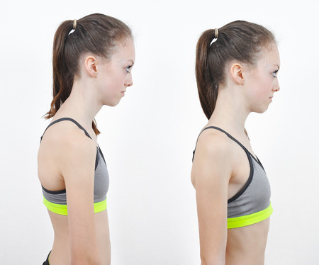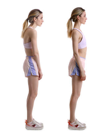 Girl with correct and discorrect position of her spine on white background
