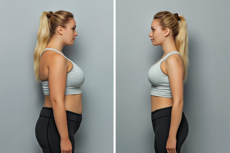 Side by side comparison highlighting a body shape transformation, emphasizing changes in physique and posture under studio lighting.