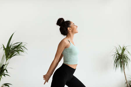 Woman in sport outfit stretching with her elbows up. Workout at home. Back view. Body positive, spring mood. Quarantine time.