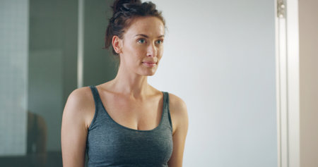 Sporty young Asian woman in gym sportswear looking away while standing against a gray wall in the gym.