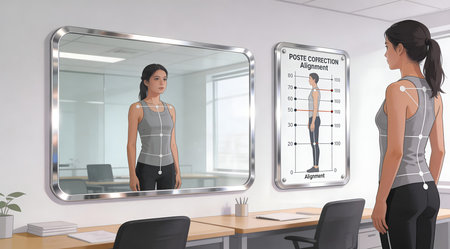 Sleek digital illustration showing soft reflective lighting and a motivational palette of silvers and whites, conveying confident alignment and corrective guidance. Ideal for commercial use in ergonomic office designs, posture training materials, wellness apps, and health promotion graphics. Targets fitness professionals, corporate wellness programs, and h... AI-generated digital illustration. AI-generated illustration.