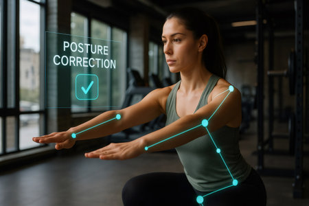 Athlete exercising using innovative technology for posture analysis and improvement, promoting health and fitness in modern gym