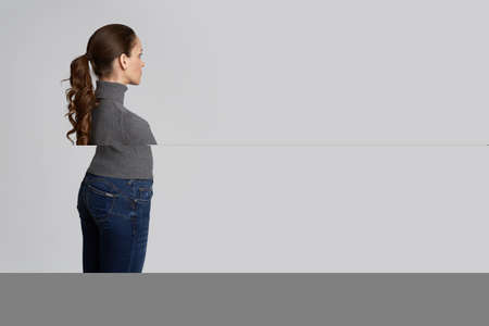 Woman posing before and after weight loss. Diet and healthy nutrition. Fitness results, get fit. Liposuction results, plastic surgery. Overweight and slim, training. Transformation from fat to athlete
