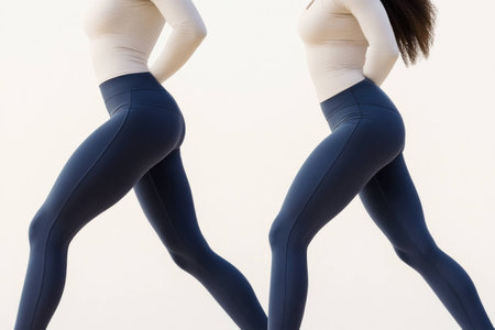 Two models in athletic wear displaying confidence and strength against a soft neutral background, promoting fitness and empowerment, showcasing diversity in beauty