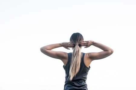 rearview of female athlete stretching before training