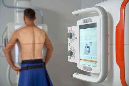 Back view of masculine male turned to scanning area scanning lungs in cabinet of radiology. Handsome man doing ultrasound diagnostic after virus. Concept of medicine technology.
