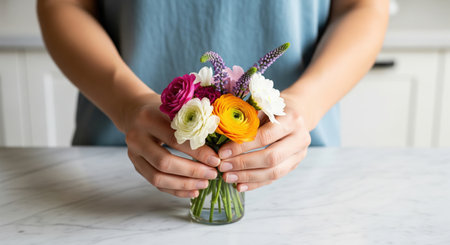 Woman holding a small glass vase filled with colorful ranunculus flowers. Soft, diffused light illuminates the scene, creating a gentle, intimate atmosphere.