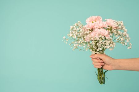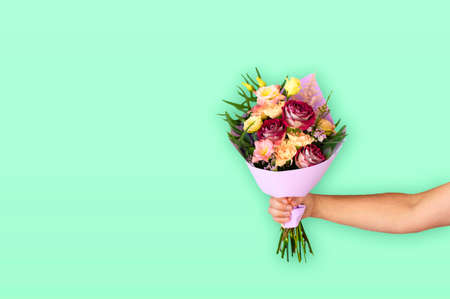 Hand of the man holding a beautiful bouquet of flowers on a green mint background. Flowers to gift. Place for text.