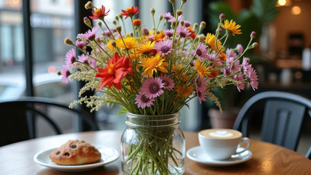 Vibrant wildflower bouquet in jar vase with coffee and pastry on cafe table. That the image is generated using AI.