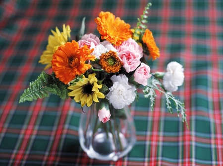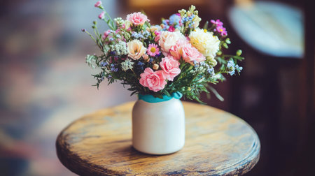 A charming floral arrangement featuring a variety of colorful flowers in a vintage vase, perfectly placed on a wooden table, ideal for home decor.