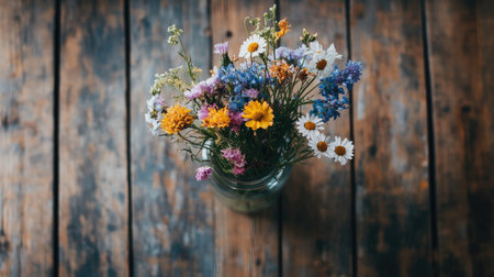 Top view of a bouquet of wildflowers in a mason jar on a wooden table