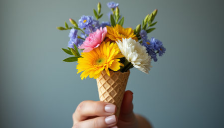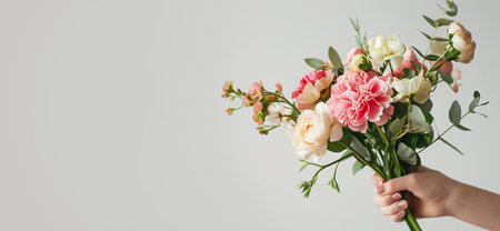 A beautiful bouquet of colorful flowers held in hand, surrounded by falling petals, symbolizing love and joy in a bright and cheerful atmosphere