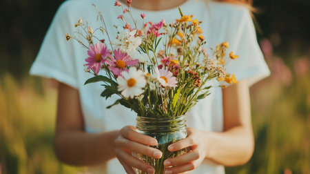 A person holds a jar filled with wildflowers in a sunny field during a warm afternoon