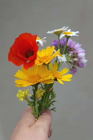 Hand of the man holding a beautiful bouquet of flowers on a gray background. Flowers to gift. Place for text.