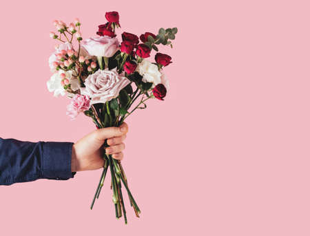 Male hand holding a beautiful bouquet on a pink background. Birthday, mother's or valentine's day gift. Copy space