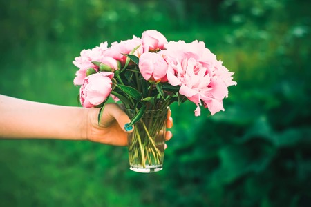 Hand holding a bouquet of pink fresh peony flowers in summer park.