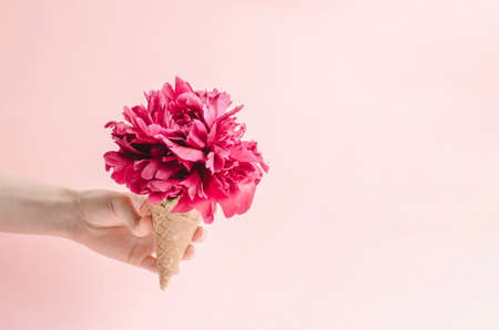 Wafer cup for ice cream with a peony flower in a woman's hand. Summer and summer gifts concept