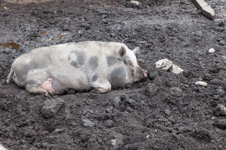 Domestic dirty hog dig mud with its snouts around mud pit with bilge, mud and murky water in pig pen during hot sunny day in countryside.