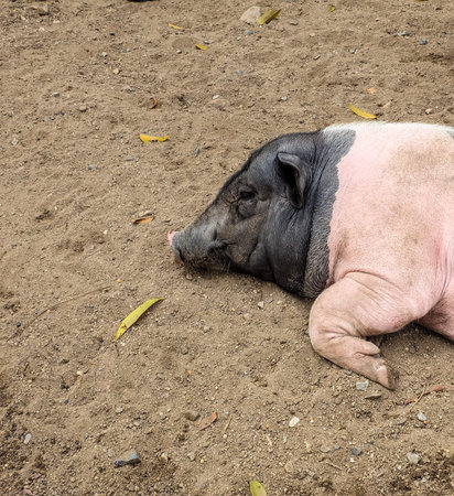 Household Pig Enjoys Relaxing In Dirt Lying In Mud. Large Black