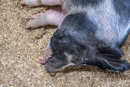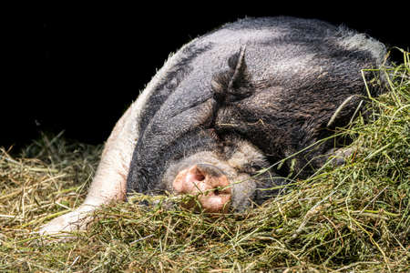 Portrait of a Vietnamese pig sleeping peacefully on a pile of straw.