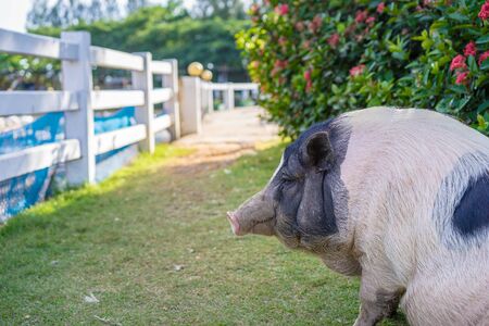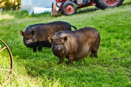 Black Vietnamese pig on the farm yard. Animal life, people and d