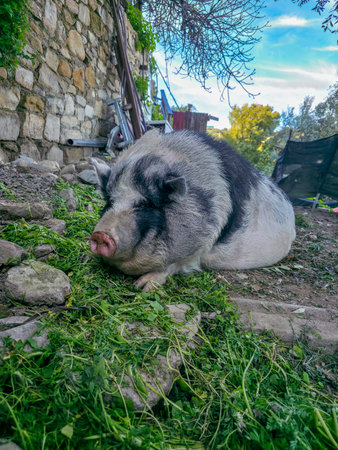 A pig living in Bussana Vecchia artist retreat medieval village destroyed by earthquake in 1887 now tourist landmark out of time