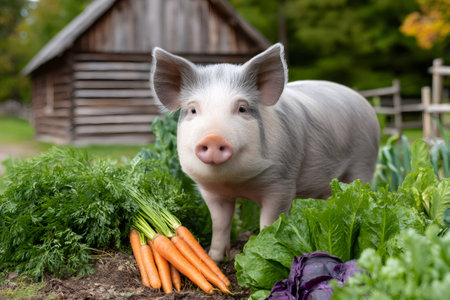 Cute pig standing near carrots, lettuce and cabbage in a vegetable garden near a wooden barn
