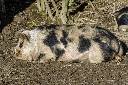 Pig asleep in a muddy pig pen on the farm at the Booker T Washington Mem orial.