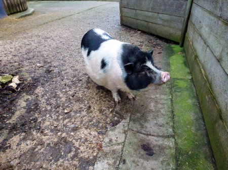 Decorative fat bicolor pig begs to eat. A pet in a pen. View from above.