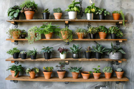 Indoor botanical display with lush green plants in pots on rustic wooden shelves