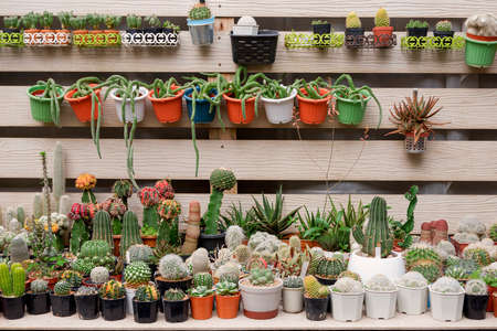 Succulent plants and cactus in pots for sale in street market. Blurred Background. Close-up. Selective focus.