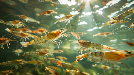 Colorful Shrimp Swim Gracefully in Clear Water, Showcasing Their Natural Beauty in an Underwater Habitat During Daylight Hours. Generative AI