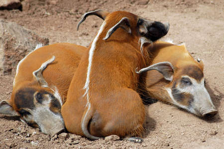 Close-up of a pair of Red River Hogs lying together on soil in a resting position