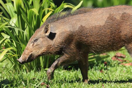 an close up image of wild pig , a free animal animal walking on the ground in the tropical jungle zone in paradise island of Rarotonga, Cook Island